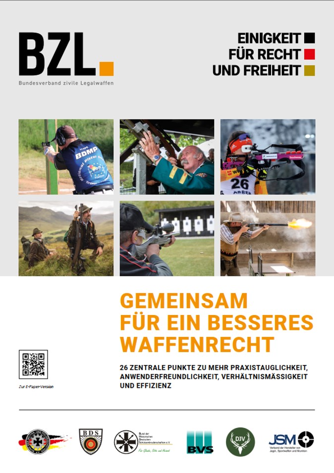 Unter dem Titel „Gemeinsam für ein besseres Waffenrecht“ hat der Bundesverband zivile Legalwaffen (BZL) eine Online-Broschüre erstellt, in der er seine 26 wichtigsten Forderungen zur Reform des Waffenrechts klar benennt, argumentativ sauber untermauert und auf 28 Seiten kompetent und knackig präsentiert.