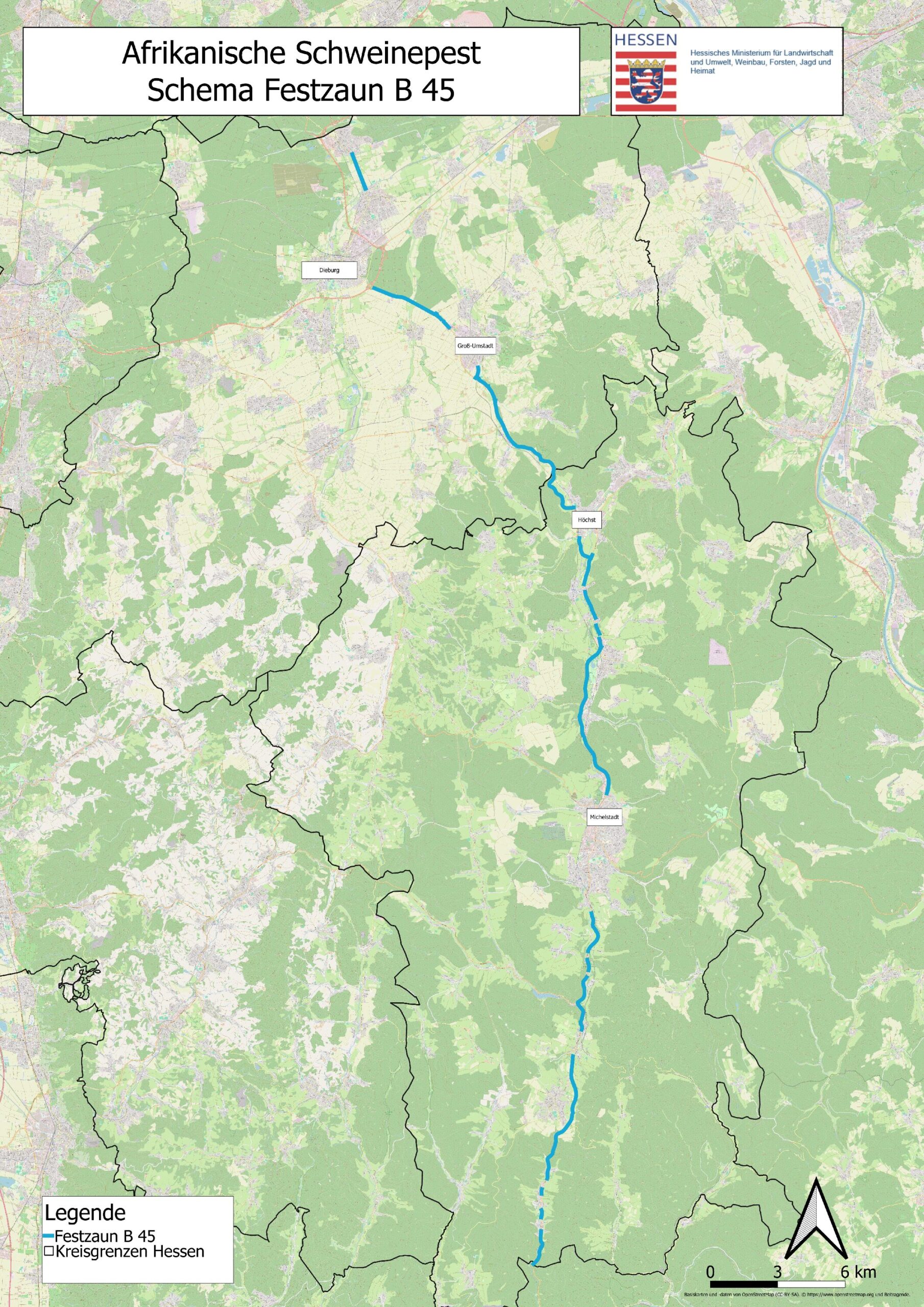 Der neue Zaun erstreckt sich von Eppertshausen bis Münster (Hessen) entlang der L3095 und führt weiter entlang der B45 bis zur Grenze zu Baden-Württemberg. Der Zaun dient als Barriere zur Eindämmung der ASP in Richtung Odenwald und in die angrenzenden Länder Bayern und Baden-Württemberg.