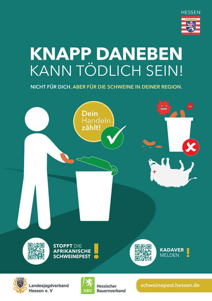 Das Land Hessen startet eine Öffentlichkeitskampagne zur Aufklärung über die Afrikanische Schweinepest. Der Landesjagdverband Hessen und der Hessische Bauernverband sind Partner der Aktion und begrüßen die Kampagne.