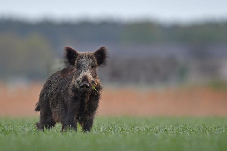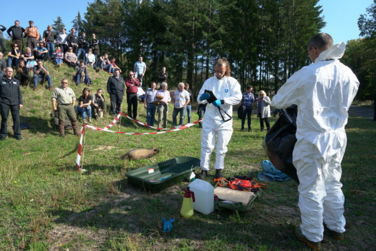 Ein toter Frischling liegt umzäunt von rot-weißem Markierungsband auf der Wiese eines alten Munitionslagers in der Nähe von Lützelbach im Odenwald. So könnte es auch bald in Deutschland aussehen, sobald der erste ASP-Positivbefund vorliegt. Rund 120 Teilnehmer, darunter auch Förster und Jäger sowie Mitarbeiterinnen und Mitarbeiter der hessischen Veterinärbehörden sind zu einer praktischen Tierseuchenübung in den hessischen Odenwald gekommen.