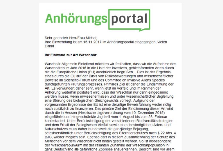 Liebe Jägerinnen und Jäger, die öffentliche Anhörung zu den Managementplänen u. a. für Waschbär und Nutria läuft noch bis zum 20. November 2017. Nutzen Sie die Chance und bringen Ihr Wissen und Ihre Argumente ein!