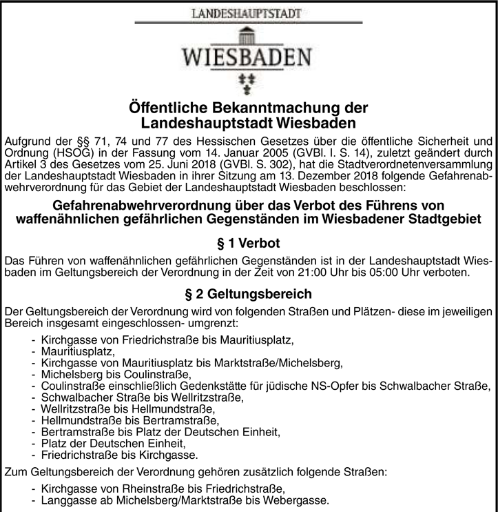 Ab dem 1. Januar 2019 gilt in Wiesbaden zwischen 21.00 Uhr und 5.00 Uhr eine Waffenverbotszone. Quelle: Wiesbadener Kurier/Stadt Wiesbaden